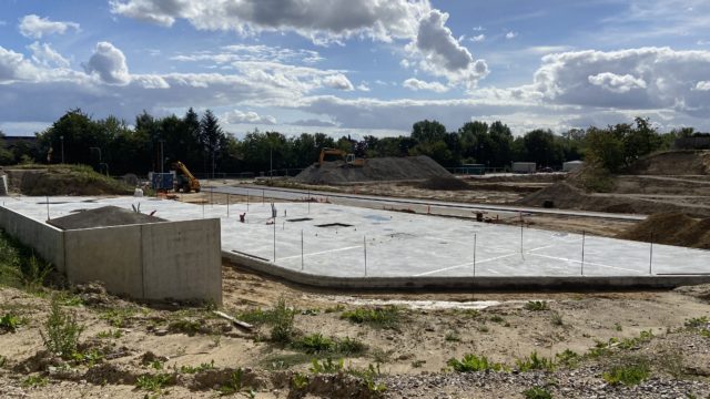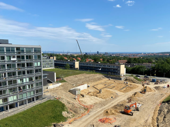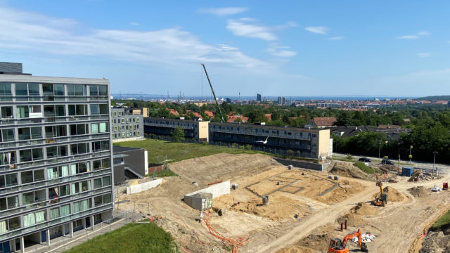 UNDER OPFØRELSE: sommer 2020. Byggepladsen ved Rymarken og Ryhavevej - man kan allerede se fundamentet til det nye fælleshus, og den store vold er nedbrudt.