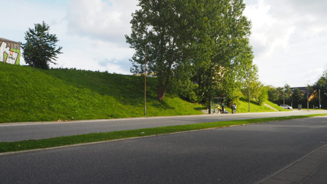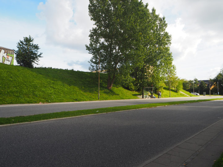 FØR: Området, hvor det nye fælleshus skal ligge, så således ud før renoveringen. Den store jordvold fjernes.