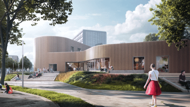 EFTER: Det nye fælleshus kommer til at ligge i bunden af Rymarken ud mod Ryhavevej, og bliver åbent for hele Hasle. (Illustration af det nye fælleshus af LINK Arkitektur).